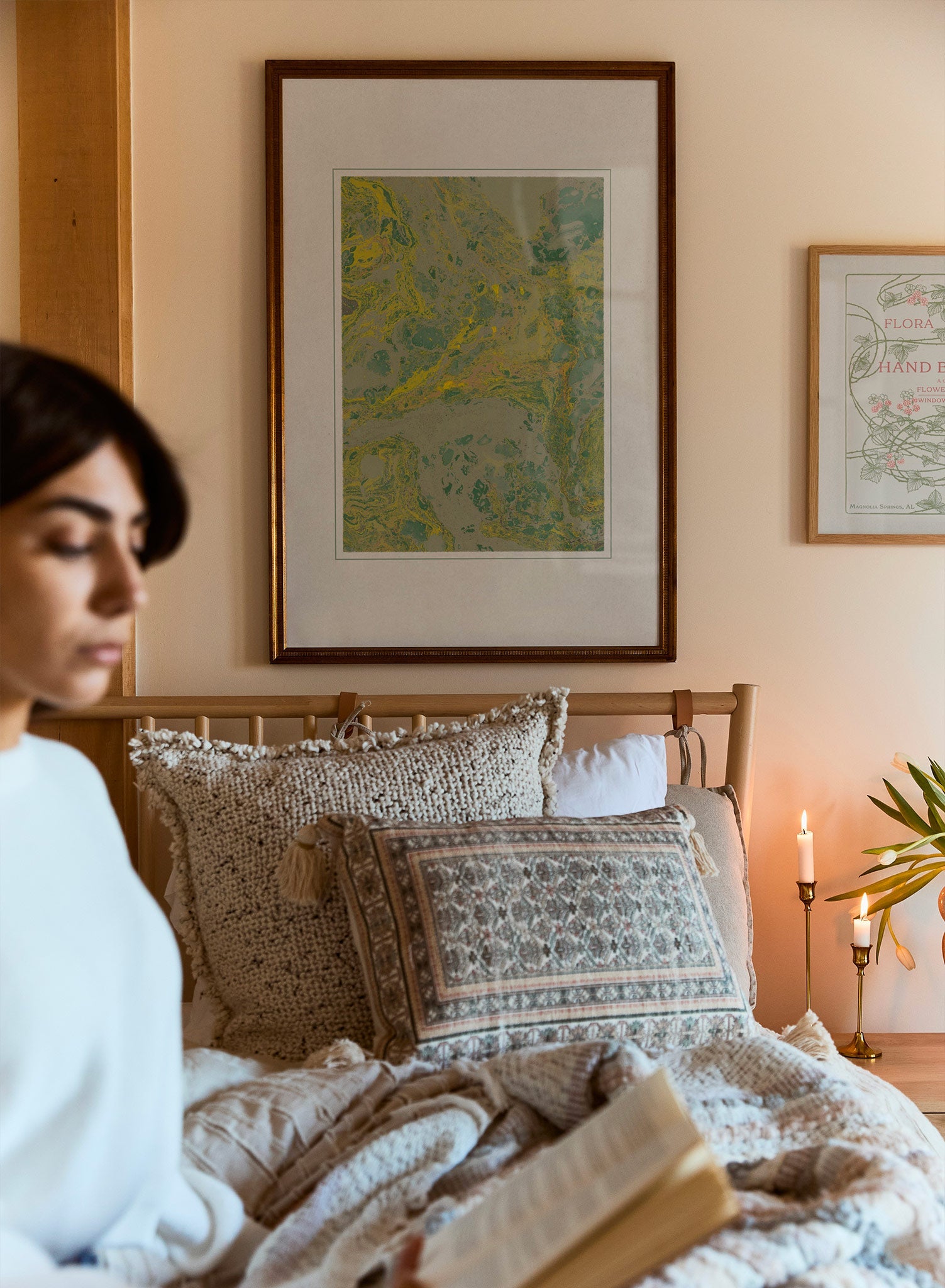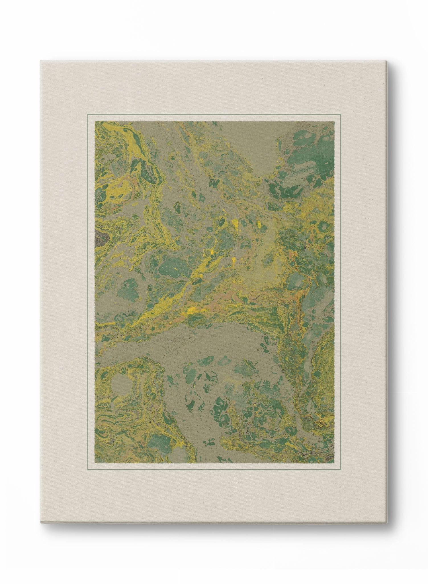 This striking art print showcases swirling patterns of gold and green, reminiscent of Italian marbled paper. The rich textures and vibrant hues create a luxurious yet natural feel, making it a bold statement piece. The intricate interplay of colors and patterns brings a sense of dynamic energy to the artwork.