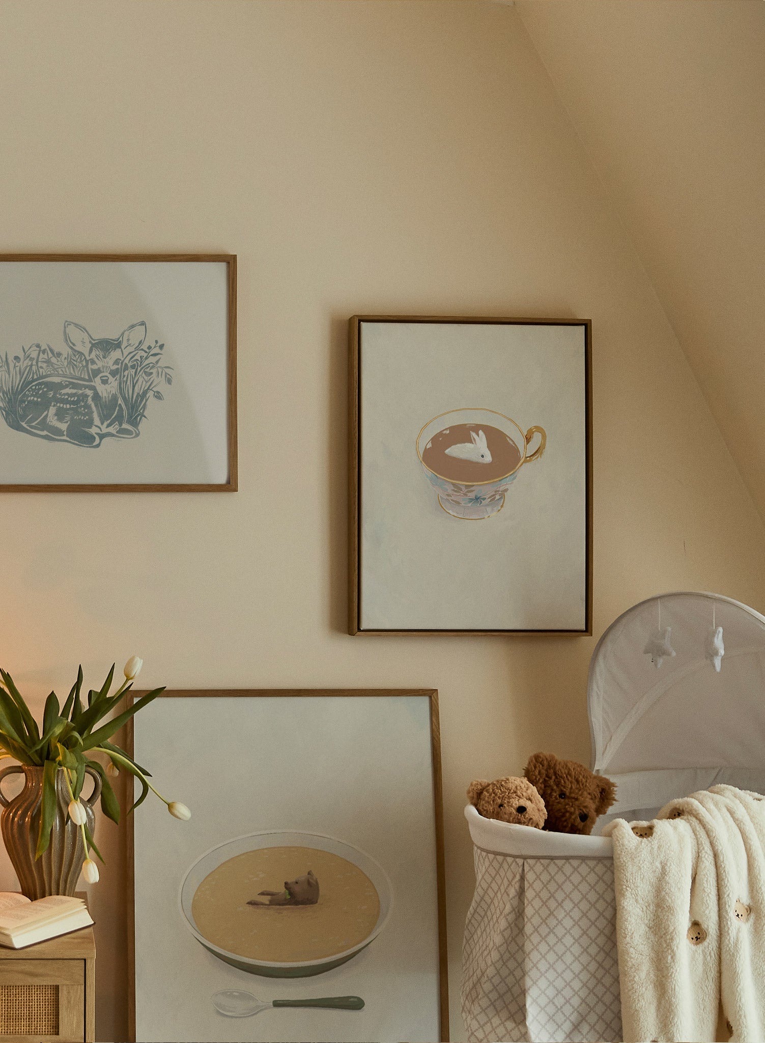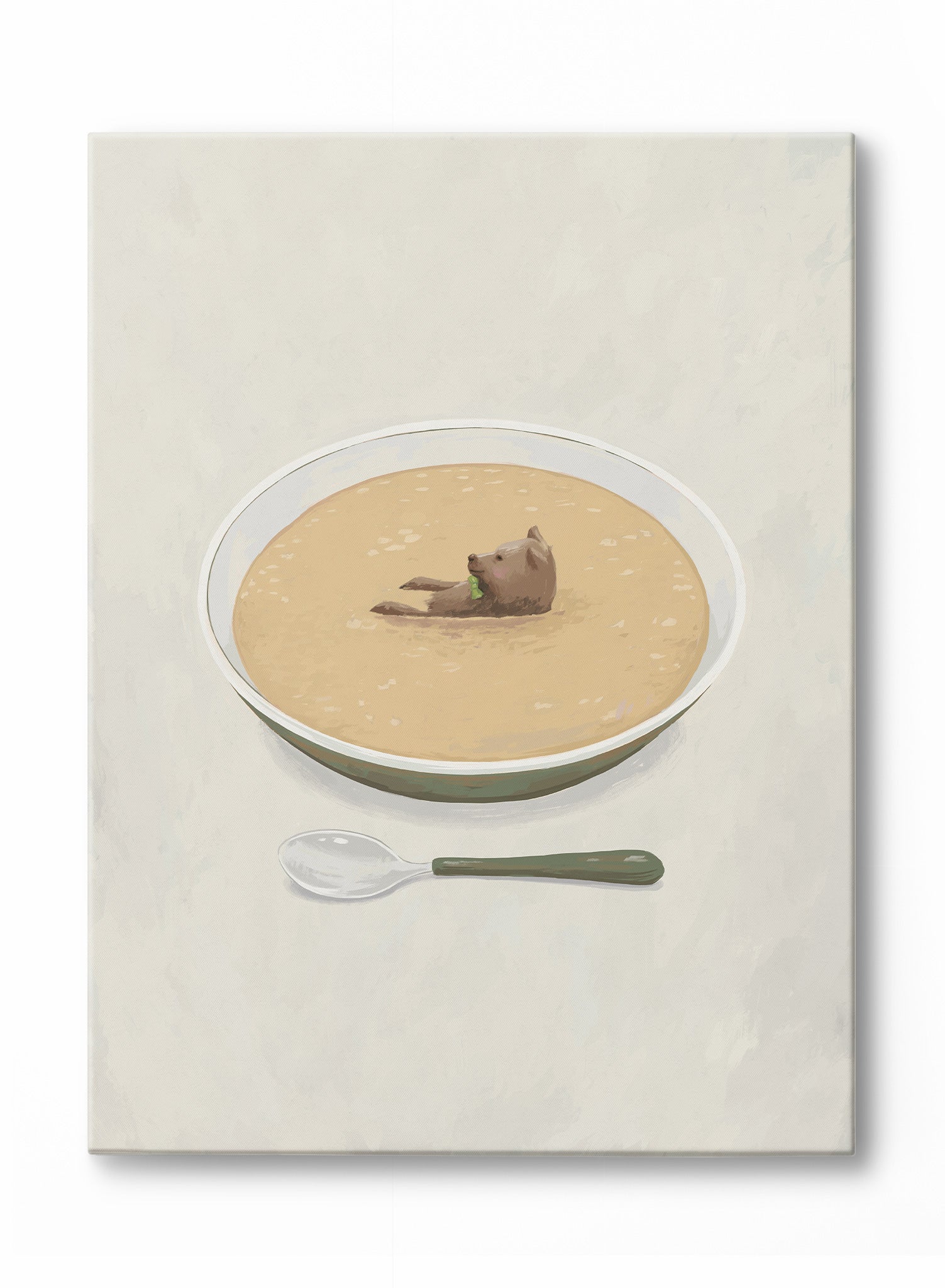 This quirky illustration of a bear lounging in a bowl of soup brings a delightful sense of humor to your decor. The soft, painterly strokes and warm color palette create a cozy yet playful vibe, perfect for family-friendly spaces.