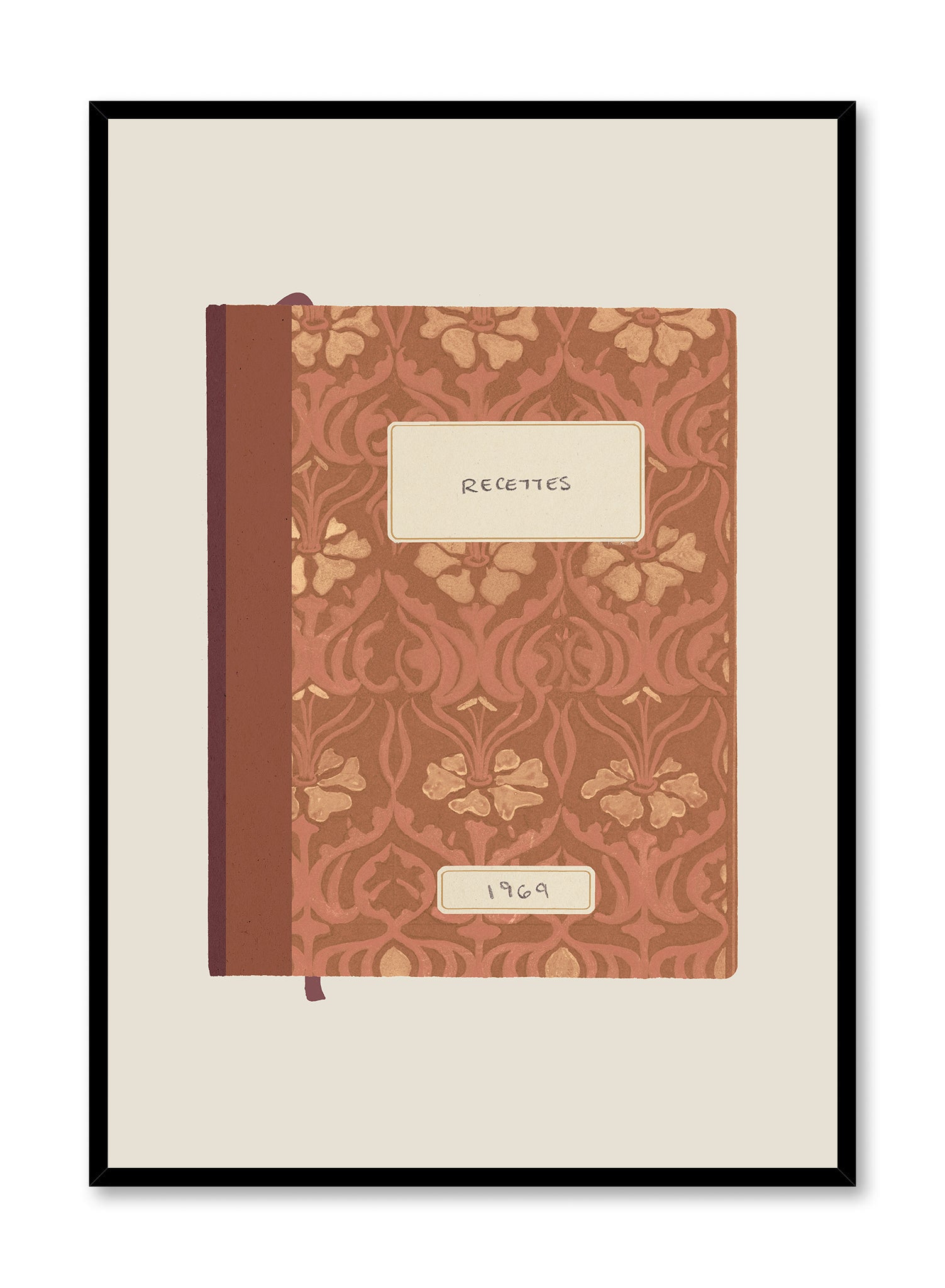 A warm, terracotta-toned notebook labeled “Recettes” is adorned with intricate floral patterns, capturing the sentimental charm of cherished family recipes. The muted palette and delicate detailing create a visual warmth.